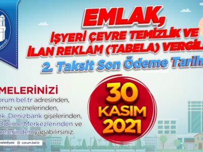 Çorum Belediyesi emlak, işyeri çevre temizlik ve ilan reklam (tabela) vergilerinin ikinci taksitinin son ödeme gününün 30 Kasım olduğunu hatırlattı. Her yıl iki ...