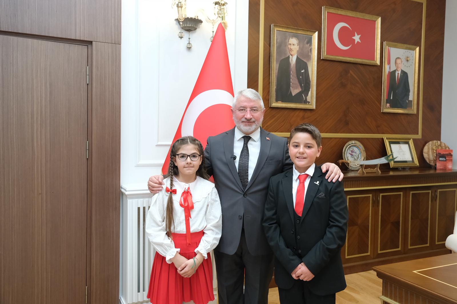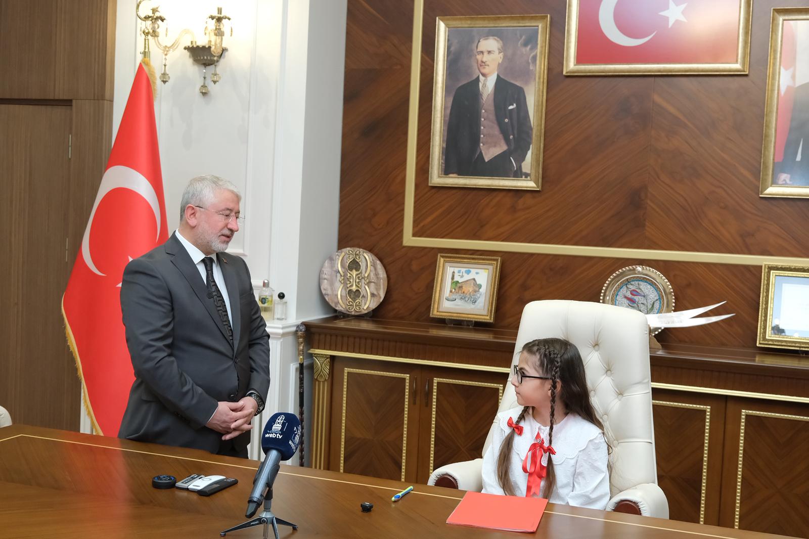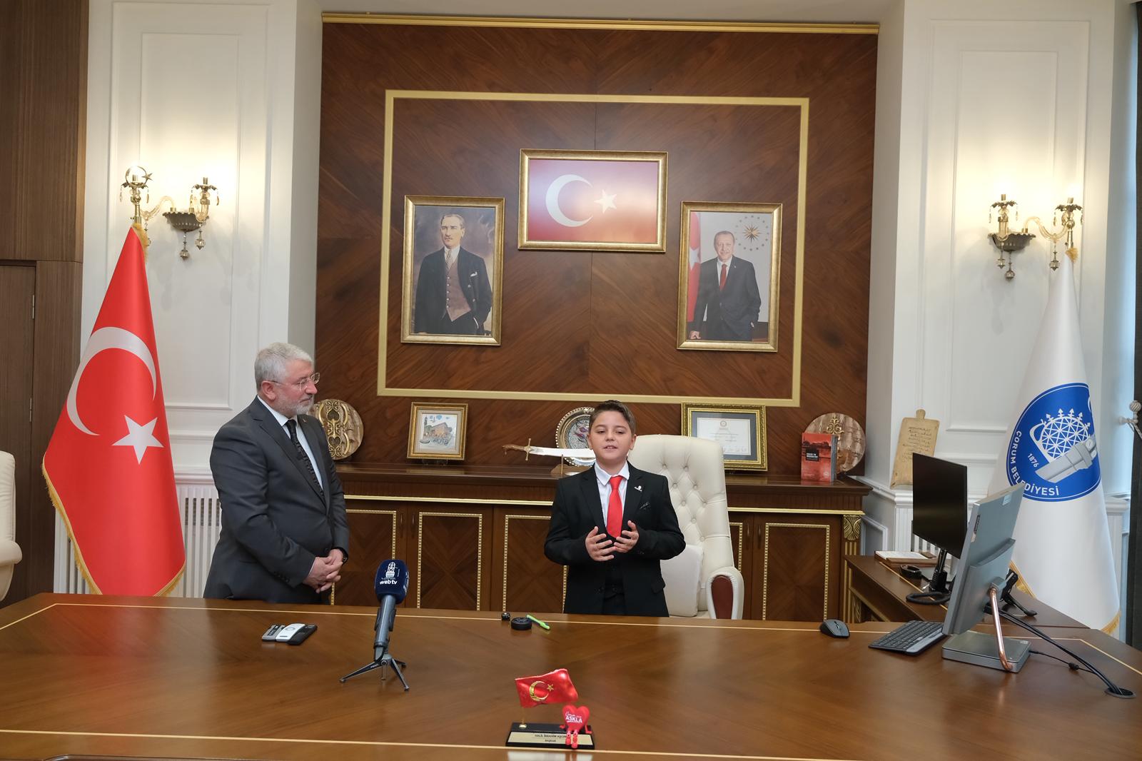 İsmail Kakaç İlkokulu 4. sınıf öğrencileri Zeynep Sözten ve Rüzgar Ali Kışla, günün anlam ve önemine uygun olarak belediye başkanlığı görevini kısa süreliğine Belediye Başkanı Dr. Halil İbrahim Aşgın’dan devraldı. Beraberinde İl Milli Eğitim Müdür Yardımcısı Tahir Demir, İsmail Kakaç İlkokulu Müdürü Cemalettin Tunç ve Sınıf Öğretmeni Filiz Türk ile birlikte makama gelen öğrenciler kendilerini hazır bekleyen birim müdürlerinden isteklerini belirttiler.