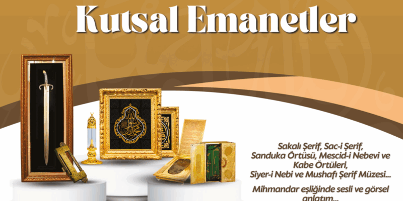 “Kutsal Emanetler Sergisi”, ziyaretçilerini İslam tarihinin en kıymetli anlarına götürecek. Sergide, Peygamber Efendimize ait Sakal-ı Şerif, Saç-ı Şerif ve Nal-ı Şerif gibi önemli emanetlerin yanı sıra Mescid-i Nebevi ve Kâbe örtüleri, Kâbe’nin anahtarı, Osmanlı dönemine ait nişaneler ve daha birçok kıymetli eser yer alacak.