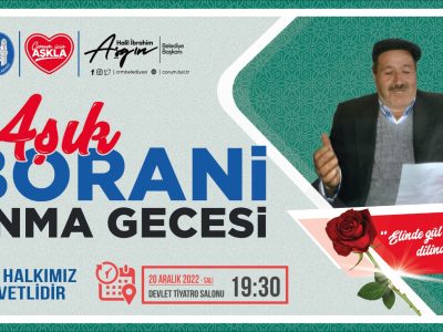 Çorum Belediyesi, ünlü halk ozanı merhum Aşık Borani’yi anma gecesi düzenledi. Aşıklık geleneğinin son güçlü temsilcilerinden Aşık Borani (Halil Çimen) geçtiğimiz yıl 8 ...