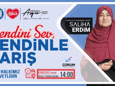 Uzman Aile Danışmanı ve Yazar Saliha Erdim “Kendini Sev; Kendinle Barış” konferansıyla 5 Ocak’ta Çorum’da. Çorum Belediyesi, sosyal ve kültürel faaliyetlerine hız kesmeden ...