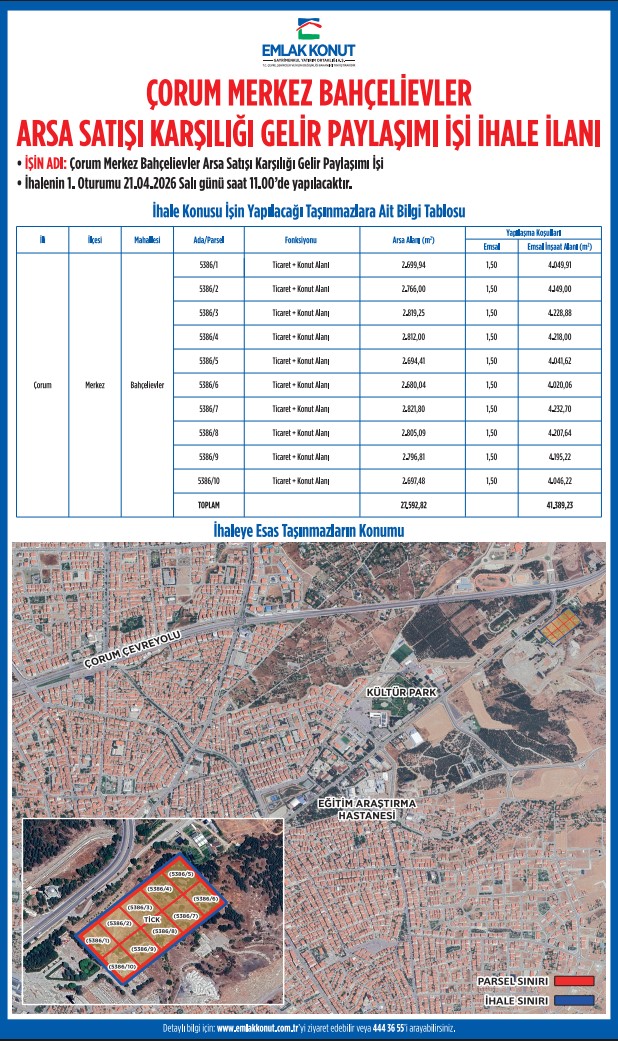 Emlak Konut Gayrimenkul Yatırım Ortaklığı, Çorum Merkez Bahçelievler’de bulunan eski çimento fabrikası arazisinde hayata geçirilecek proje için “Arsa Satışı Karşılığı Gelir Paylaşımı İşi” ihalesinin 1. oturumunun 21 Nisan 2026 Salı günü saat 11.00’de gerçekleştirileceğini duyurdu.