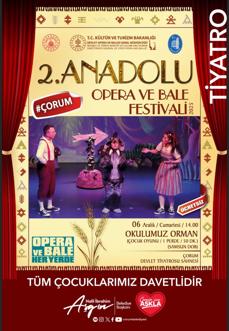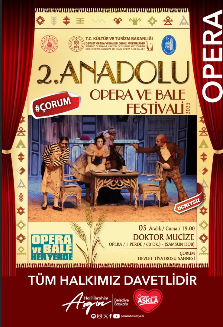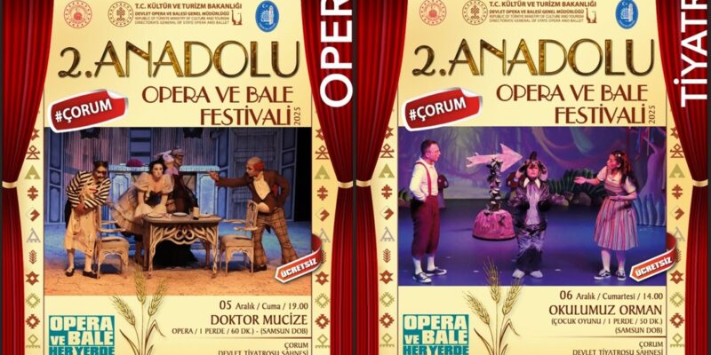 T.C. Kültür ve Turizm Bakanlığı Devlet Opera ve Balesi Genel Müdürlüğü tarafından düzenlenen 2. Anadolu Opera ve Bale Festivali, Çorum Belediyesi’nin ev sahipliğinde sanatseverlerle buluşuyor. Festival kapsamında Samsun Devlet Opera ve Balesi’nin iki özel temsili Çorum Devlet Tiyatrosu Sahnesi’nde ücretsiz olarak izleyiciyle buluşacak.