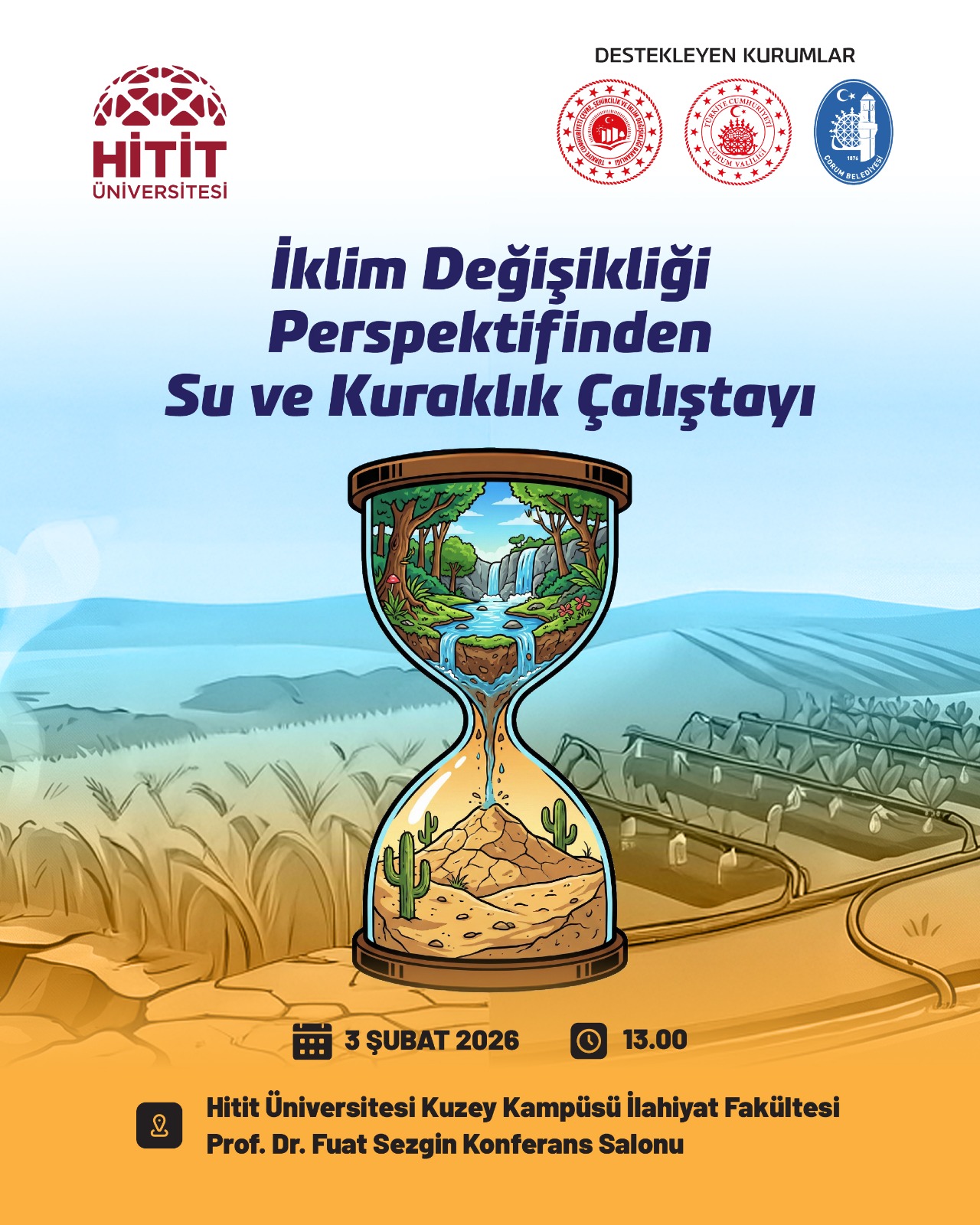 Hitit Üniversitesi ev sahipliğinde; Çevre, Şehircilik ve İklim Değişikliği Bakanlığı, Çorum Valiliği ve Çorum Belediyesinin destekleriyle “İklim Değişikliği Perspektifinden Su ve Kuraklık Çalıştayı” 3 Şubat 2026 Salı günü düzenlenecek.